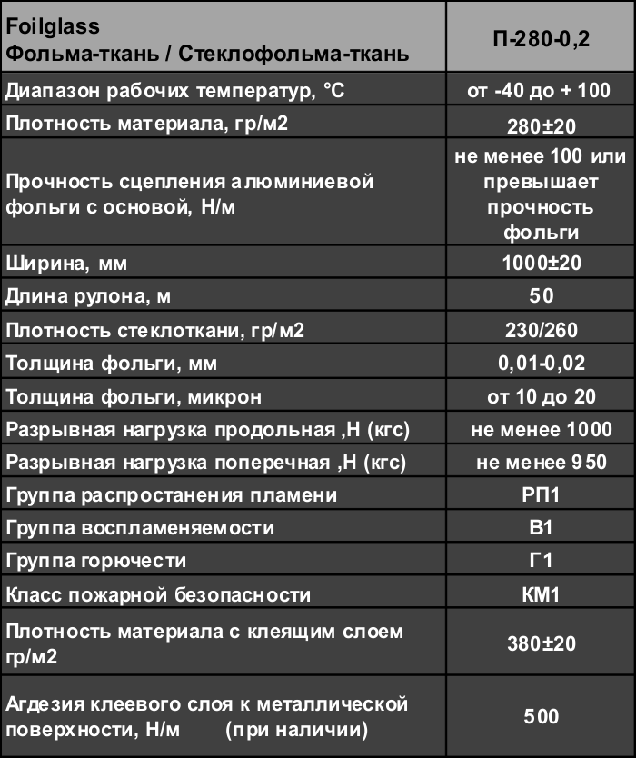 представляет из себя стеклоткань покрытую алюминиевой фольгой. Изготовлена из экологически чистых материалов. Foilglass Фольма-ткань (П) 280-0.2-1000 относится к трудногорючим материалам (Г1). Защищает теплоизоляцию на трубопроводах (теплотрассах) от внешних воздействий окружающей среды (осадки, ветер, УФ-излучение, дикие животные, грызуны т.д.) и сохраняет температуру внутри изолируемого объекта (принцип термоса). Изоляционный материал термостоек, паронепроницаем, стоек к коррозии, грибкам и плесени.